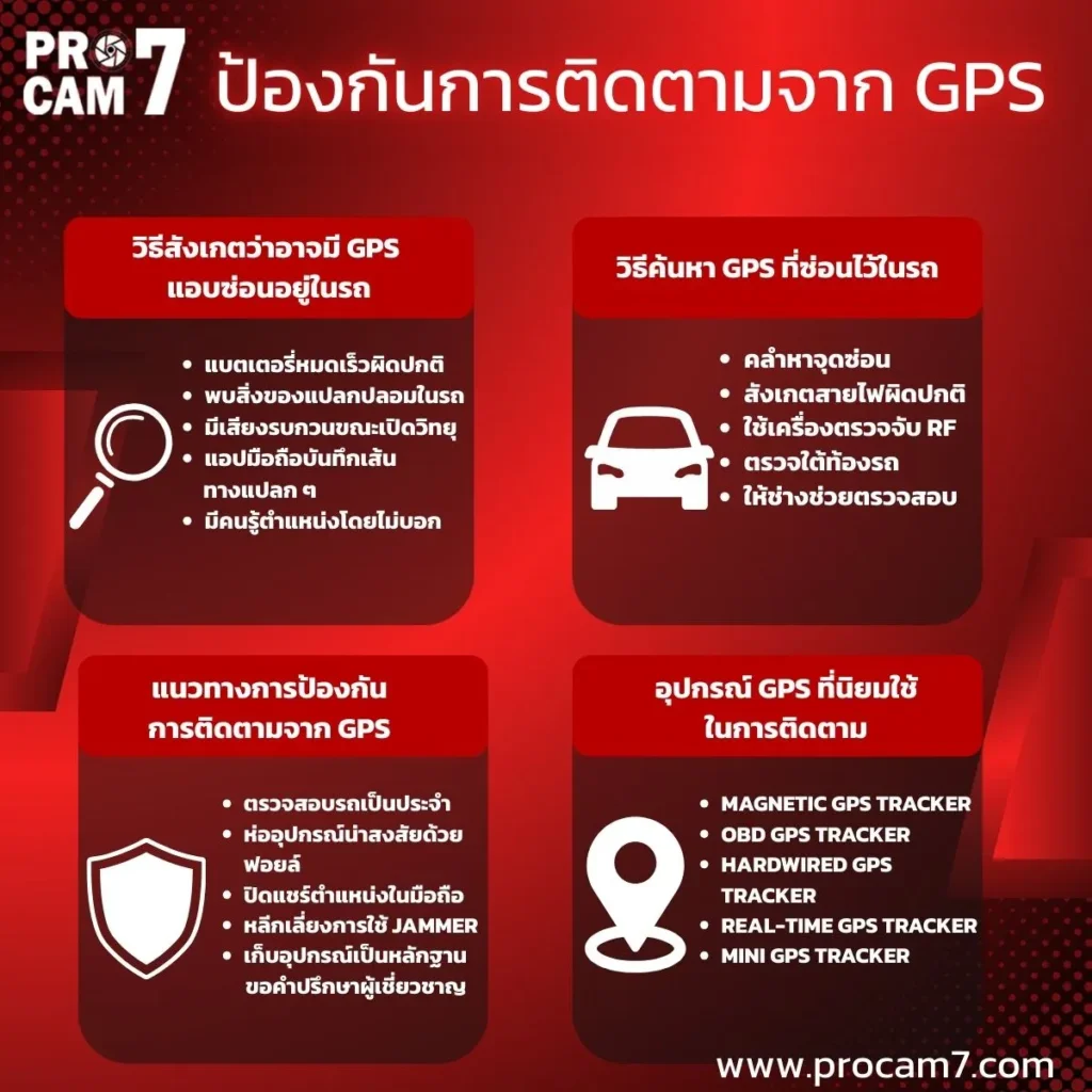 หากคุณสงสัยว่าถูกติดตาม ควร เริ่มจากการตรวจสอบรถของคุณ, ใช้เครื่องมือช่วยตรวจจับ, และ ขอความช่วยเหลือจากผู้เชี่ยวชาญหรือเจ้าหน้าที่ตำรวจ เพื่อปกป้องความเป็นส่วนตัวของคุณและคนที่คุณรัก